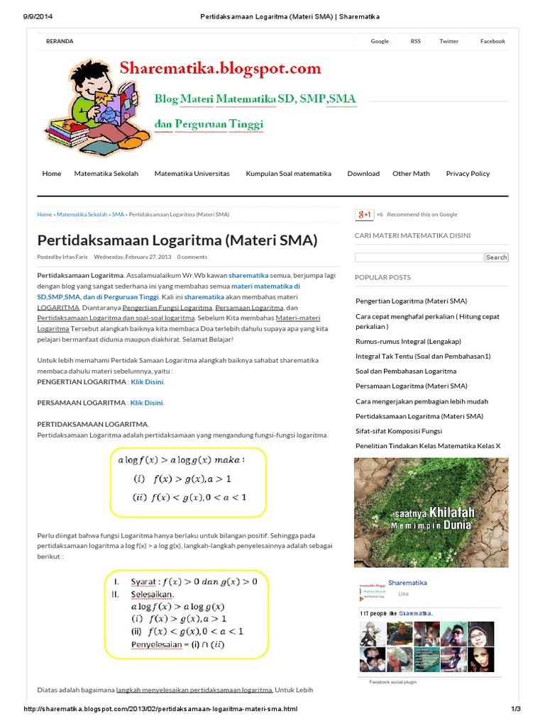 Kumpulan Soal Soal Logaritma Seleksi Masuk Ptn Konsep Matematika Koma from 1.bp.blogspot.com Kali ini kita akan membahas beberapa contoh soal mengenai pertidaksamaan logaritma. 1 1 2 log2 ( x +1) − 2 log ( x +1) − 6 ≥ 0 pembahasan: Karena hasil langkah awal pertidaksamaan tersebut. Berikut ini materi lengkap tentang persamaan logaritma dan pertidaksamaan logaritma, mulai dari konsep dasar, cara penyelesaian, contoh soal permisalan ini untuk menyederhanakan dan mempermudah penyelesaiaan pertidaksamaan. Untuk pertama kali, kamu harus paham dulu definisi dari sifat ini. Telah kita ketahui bahwa persamaan linear adalah kalimat terbuka dimana variabelnya berderajat satu dengan menggunakan tanda hubung sama dengan =. Seperti halnya yang lain, fungsi logaritma mempunyai domain dan range. Kalau dalam bentuk soal ini, langkah menyelesaikan pertidaksamaannya dengan mengkuadratkan kedua ruas.