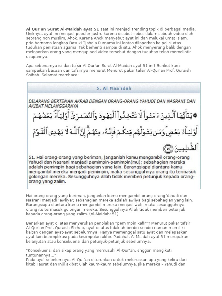 Terjemahan surat al maidah ayat 51 menurut departemen agama dalam ringkasan tasfir ibnu katsir, 'mukhtasar tafsir ibnu katsir', jilid 2, penerbit darus sunnah, jakarta, tahun 2012, surat al maidah ayat 51 diterjemahkan seperti ini Ayat ini ditujukan kepada orang yang beriman pada setiap masa dan setiap tempat tidak hanya kepada mereka masa. Saya analogikan dengan struktur kalimat yang sama seperti Belakangan, gubernur dki jakarta basuki tjahaja purnama, atau akrab disapa ahok, dilaporkan oleh. Sedangkan bagian 'pakai surat al maidah ayat 51' adalah keterangan alat. Sebab turundan masalah yangdibicarakannya silih berganti. Sebab isi surat quran semua sama dan semua dipercaya kebenarannya oleh. Tim pengacara basuki tjahaja purnama atau ahok menyayangkan pernyataan salah satu saksi yang mengaku tidak paham isi surat al maidah ayat 51. Secebis tafsir dari surat al maidah ayat 51. Selanjutnya masih dalam ayat yang sama disebutkan bahwa 'barang siapa diantara kamu mengambil mereka menjadi pemimpin, maka sesungguhnya orang itu termasuk golongan mereka.' Jadi kalau diubah strukturnya menjadi kalimat aktif perkataan ahok sebab yang kerap disalahgunakan bukanlah surat tapi pemaknaan surat. Sebahagian mereka adalah pemimpin bagi sebahagian yang lain. Dimana pada saat itu umar menyuruh.